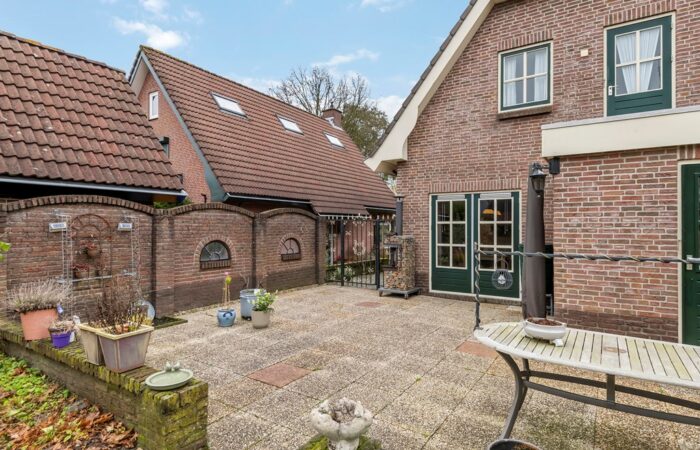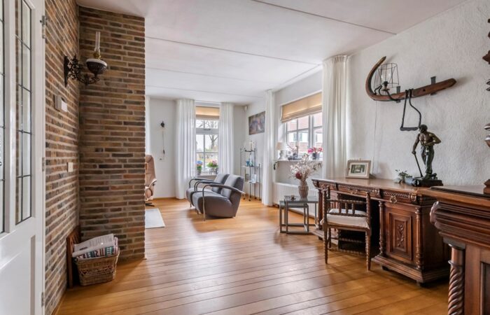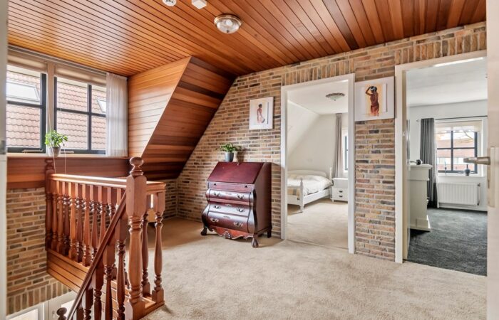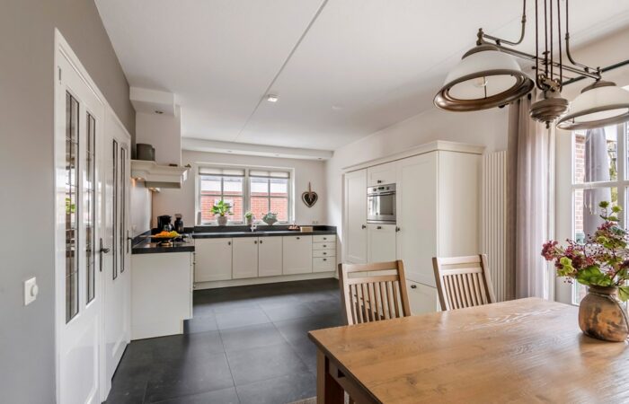 Aan de zijkant van de woning treffen we de officiële entree van de woning. De ontvangsthal voorziet in een toilet, meterkast, trapopgang naar de eerste verdieping, de kelder, alsmede de doorgang naar de keuken en woonkamer. De riante living is een heerlijke plek om te ontspannen. Ook de gezellige en functionele houtkachel draagt hier aan bij. Dankzij de vele raampartijen is deze ruimte royaal en licht. Aan de achterzijde van de woning bevindt zich de ruime en gezellige woonkeuken van ca. 22 m². Hier is voldoende plek voor een royale eethoek, waar u uitgebreid kunt tafelen met familie en vrienden. Terwijl u staat te koken aan het ruime werkblad, blijft u gemakkelijk in contact met iedereen aan tafel. Dankzij de dubbele openslaande deuren heeft u daarnaast een fijn zicht op de achtertuin. Vanuit de keuken is de praktische bijkeuken bereikbaar, waar de cv-ketel (Intergas HRE, 2024) en de wasmachineaansluiting zijn gesitueerd. Tevens bevindt zich hier de doorgang naar de tuin.