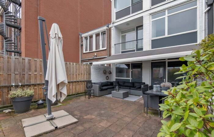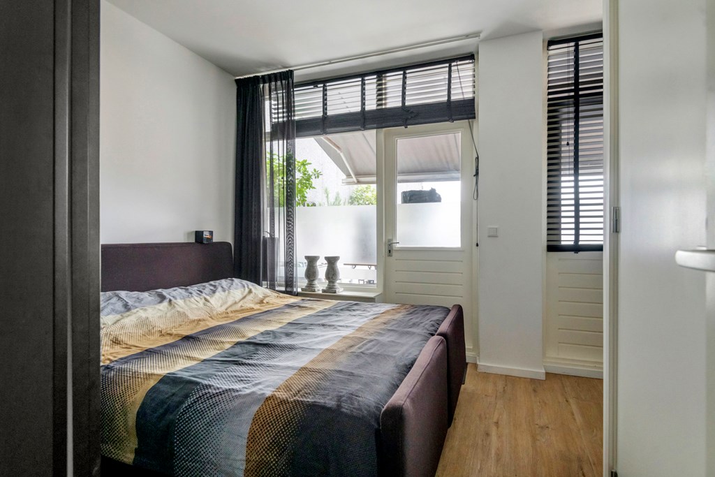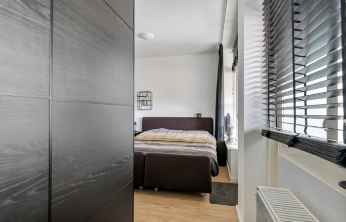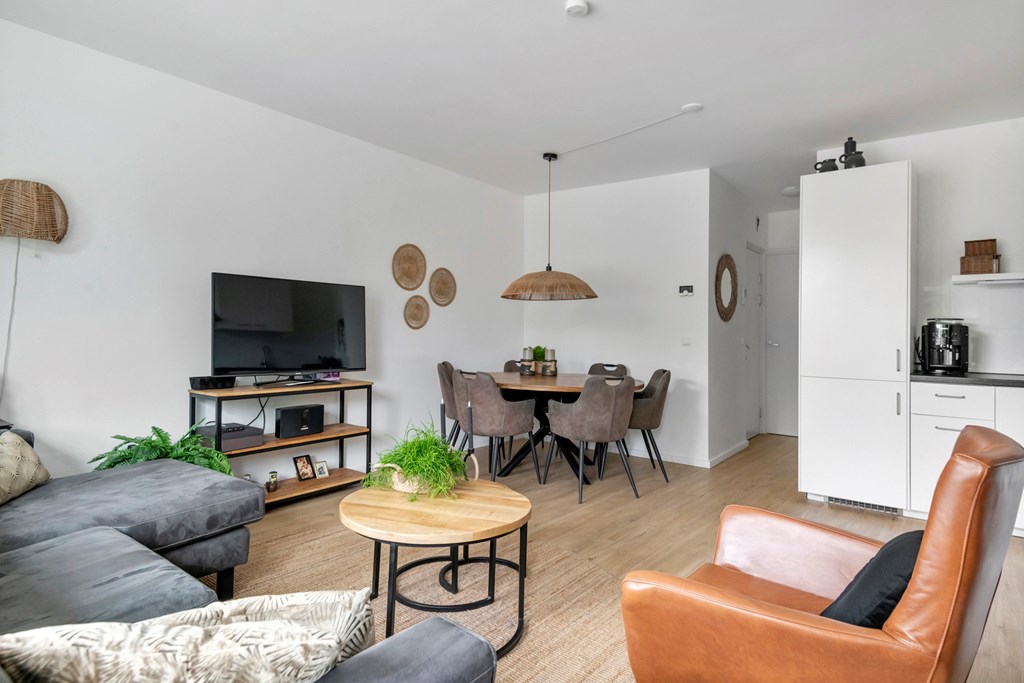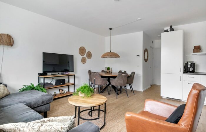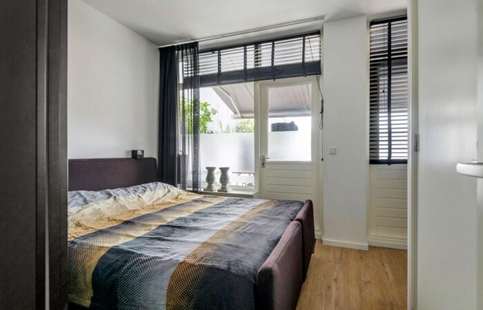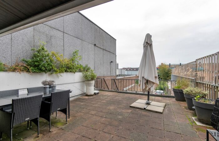 Wanneer we bij het gebouw aankomen, komen we via de centrale entree met beveiligde intercom binnen. Hier neemt u de trap naar de eerste verdieping, waar het appartement is gelegen. Eenmaal binnen komt u terecht in de hal, die toegang biedt tot de verschillende vertrekken. De woonkamer is een prettige en lichte ruimte, waar de open keuken op aansluit. De keuken is uitgevoerd met strakke witte kasten en een zwart werkblad en is voorzien van diverse inbouwapparatuur, waaronder een koelkast, vriezer, oven, vaatwasser, inductiekookplaat en afzuigkap. De slaapkamer is gelegen aan de rustige achterzijde van het appartement en biedt voldoende ruimte voor een tweepersoonsbed en een kledingkast. Vanuit de slaapkamer is er toegang tot het ruime dakterras van maar liefst 42 m². Dit terras is een heerlijke, rustige plek, ideaal voor een comfortabele loungeset en/of eettafel. De badkamer is modern ingericht en voorzien van een ruime inloopdouche, een wastafelmeubel en een designradiator. Het separate toilet is eveneens netjes afgewerkt en voorzien van een fonteintje.